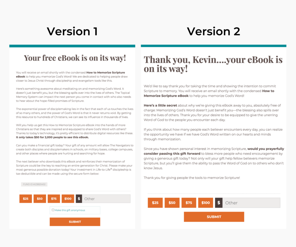 Version 2 called the reader by name, used conversational language, and use a friendly and human tone. By doing so, it led to a 46% increase in people donating!