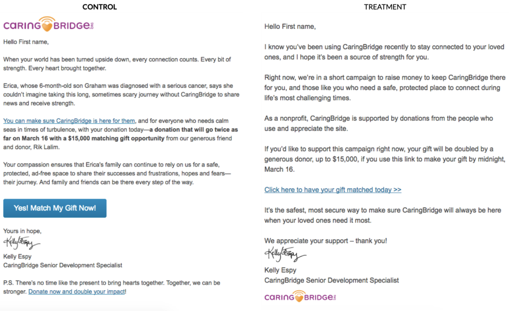 By stripping away significant aspects of the HTML email template, the more personal-looking email saw an 80.3% increase in clicks and a 112.5% increase in donations. Looking at the treatment, there clearly are more “designed” elements that could be removed to make the email more personal in appearance. So this organization launched a new experiment to take the concept one step further.