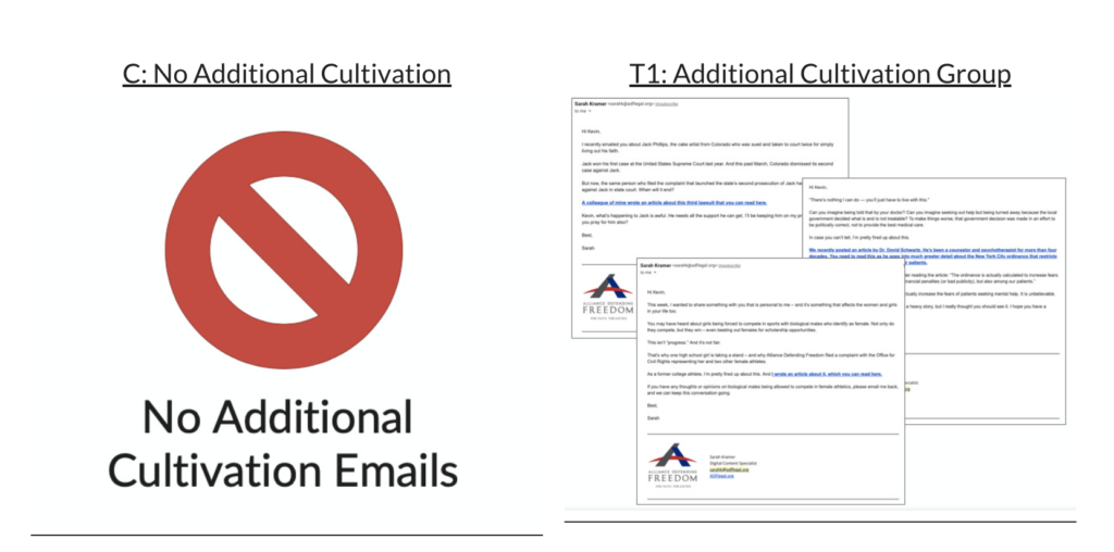 The control group received the standard welcome series. The treatment group received the same welcome series while also seeing branded advertising on Facebook that provided additional information about the organization.
