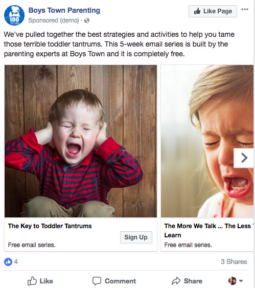 In this experiment, Boys Town was running a Facebook advertising campaign to try and acquire new email addresses and grow their file. They were offering a free 5-week email series to help parents learn how to handle toddler tantrums.