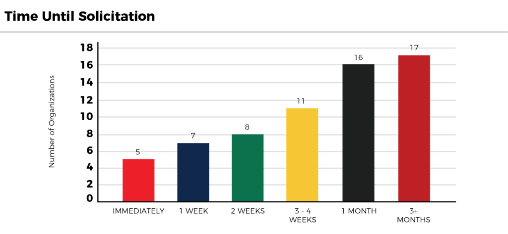 Now, when it comes to email appeals, frequency, how many you should send, how soon, etc. there are a lot of factors to consider (quality of the email and appeal being a big one) but when someone first signs up to get your emails they are engaged β enough to find and fill out your form β so there is an opportunity to use those first emails to further engage, build a relationship, and, possibly, move to a donation. Something many organizations aren’t doing at all or not very quickly as 52% of organizations that did ask did so after 30 days: