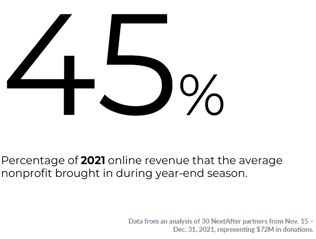 Through this study, we learned that about 45 percent of the average nonprofit’s total online revenue for the year comes in during those last 45 days of the year.