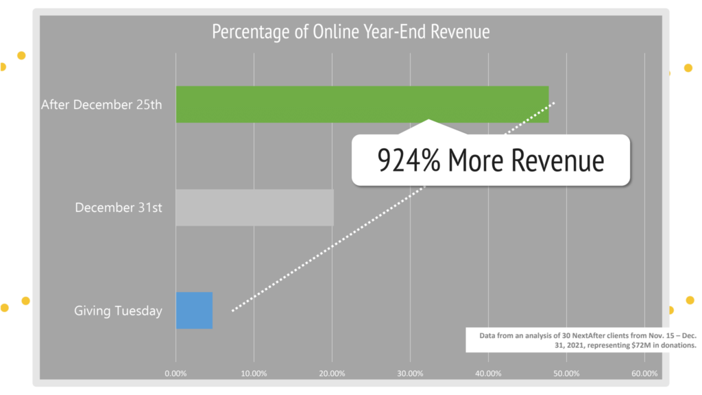 GivingTuesday brings in about 4% of online revenue for the year-end season in one day, which is really significant. It’s a lot of revenue, so don’t get me wrong there. It’s an important day that you should be present for and you should have a plan around, but it’s not everything. When we compare it to the last day of the year, December 31st brings in 20% of online revenue for the year-end season.