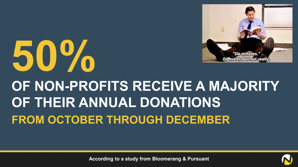 We’ve gone and we’ve looked at some other benchmarks as well. Our friends at Neon One have found that a third of annual giving occurs in the month of December, which is essentially saying the same thing. Slightly different timeframe, slightly different number, but it’s essentially saying the same thing. Our friends at Pursuant and Bloomerang have found that 50% of nonprofits receive a majority of their donations, their annual donations, in the fourth quarter, which again is different, but it’s not really different.