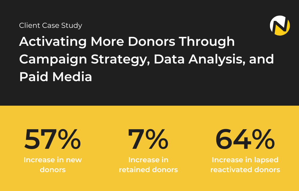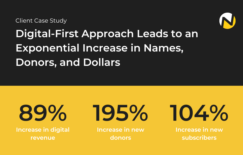 We help nonprofit organizations embrace a digital-first approach to fundraising—helping you reach more donors, earn more revenue, and accelerate your impact. View real-world results we’ve achieved for our clients and book a free discovery call to learn more about how we can help you grow.