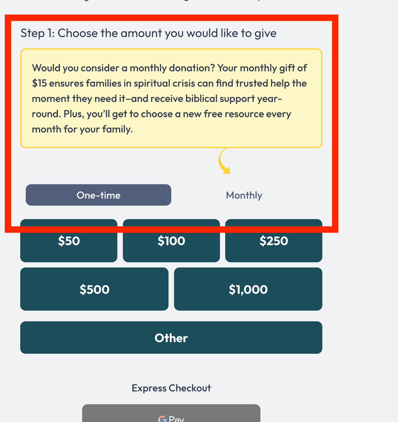 We believe that adding a monthly giving callout above the donation form on the main donation page will increase monthly donor conversions, as framing monthly giving as impactful and rewarding will motivate recurring support without displacing larger one-time donations. Because framing monthly giving as impactful and rewarding will motivate recurring support without displacing larger one-time donations.