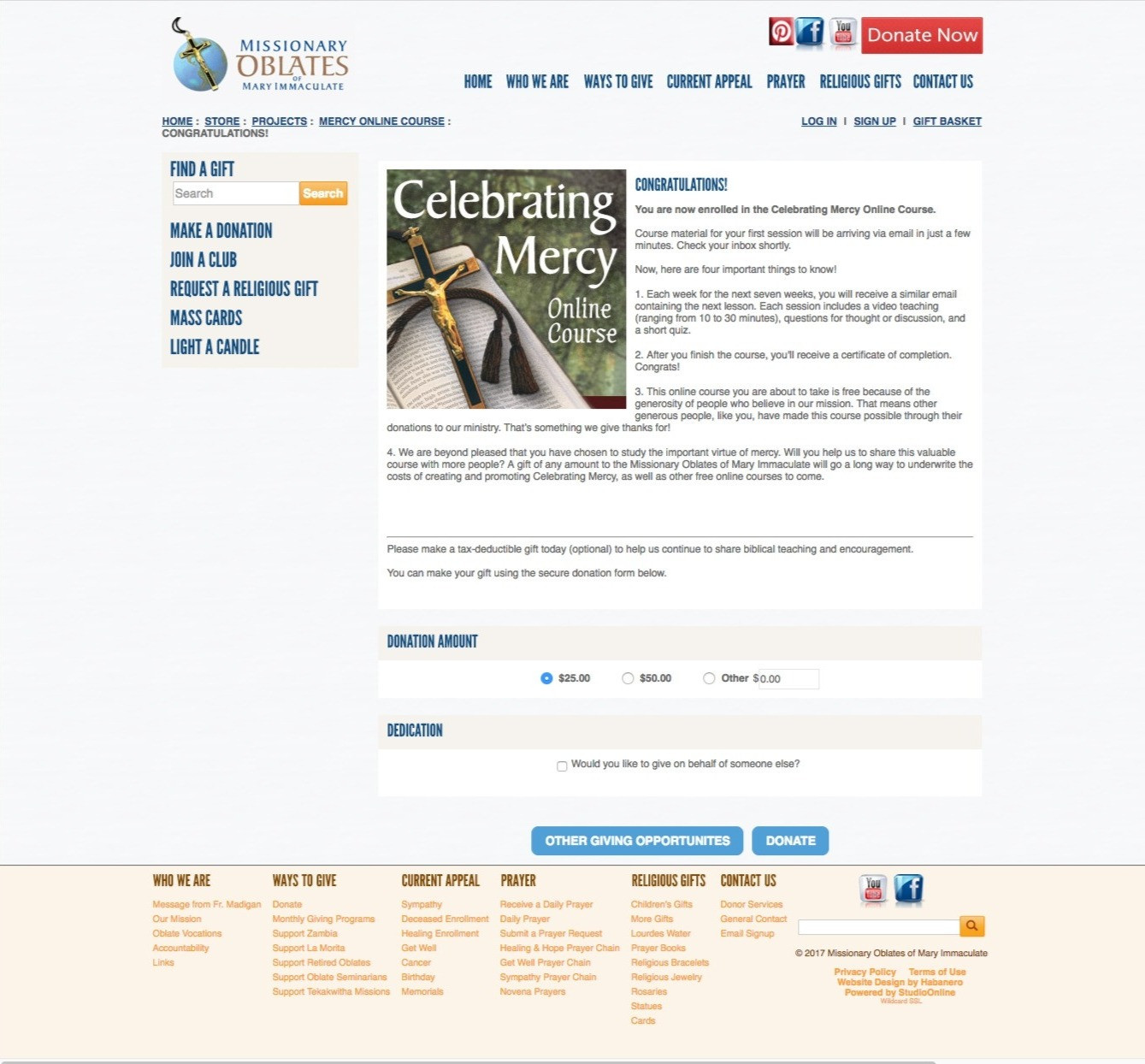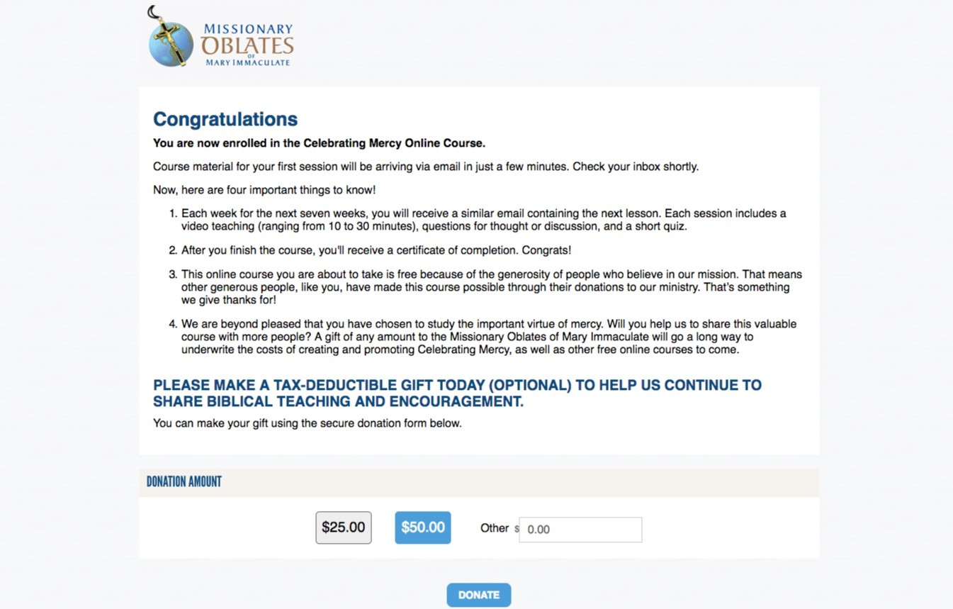 In an effort to improve the instant donor conversion on the Missionary Oblate’s Celebrating Mercy online course, we wanted to see if we could improve the overall user experience for the donation page. This involved making it mobile-friendly, removing the navigation on the page, and making the text easier to read and follow.