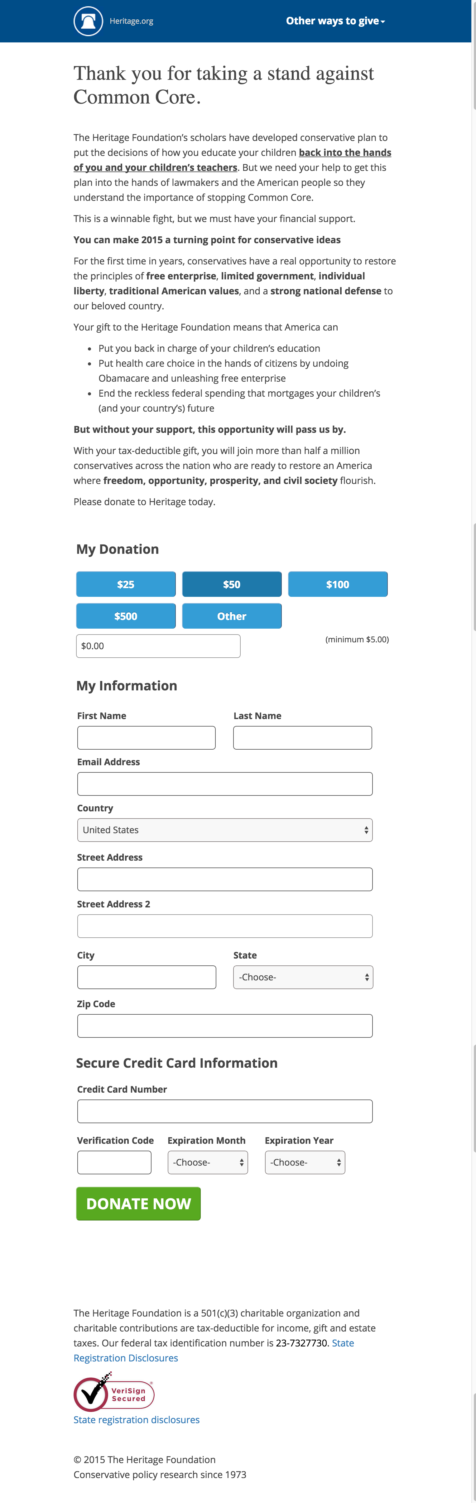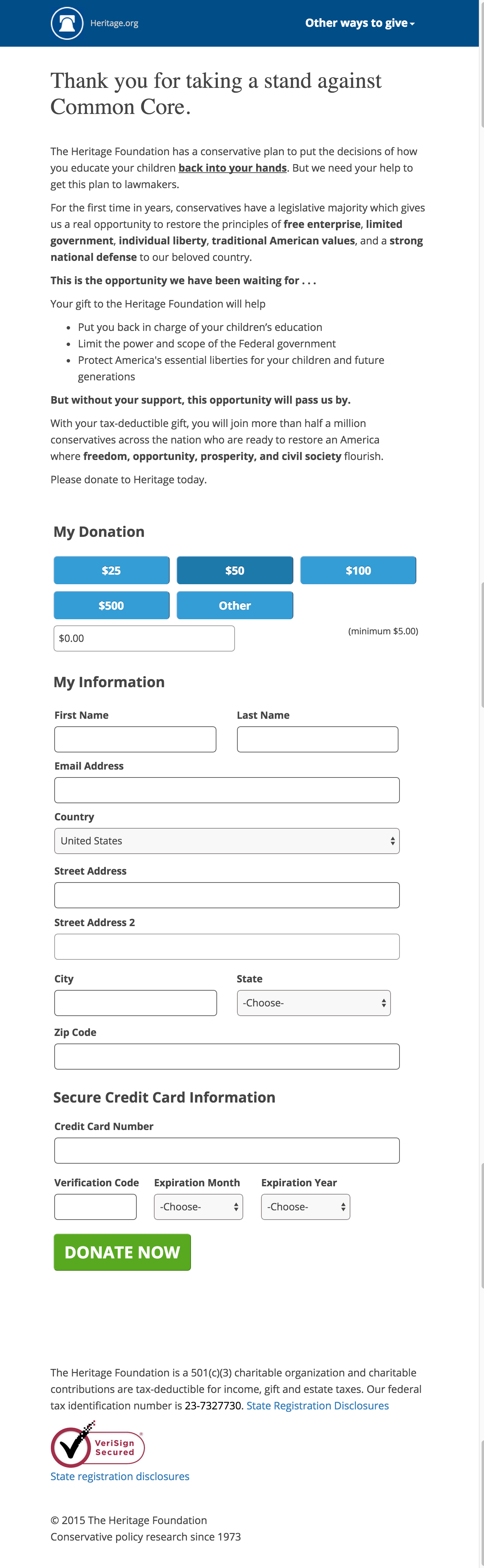 Heritage was running an email acquisition campaign using a petition against the government’s Common Core initiative. As part of the process, signers to the petition would be sent to a donation page following their signature. The standard practice for these types of campaigns was to create a landing page thanking them for their signature and asking them to make a gift to Heritage based upon the high-level value proposition of Heritage.