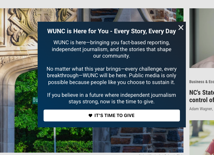This experiment was conducted for WUNC, a public radio station serving North Carolina, to evaluate the impact of homepage pop-up messaging on donor acquisition. The goal was to determine whether leaning into urgency and future challenges would outperform messaging focused on WUNC’s lack of a paywall.