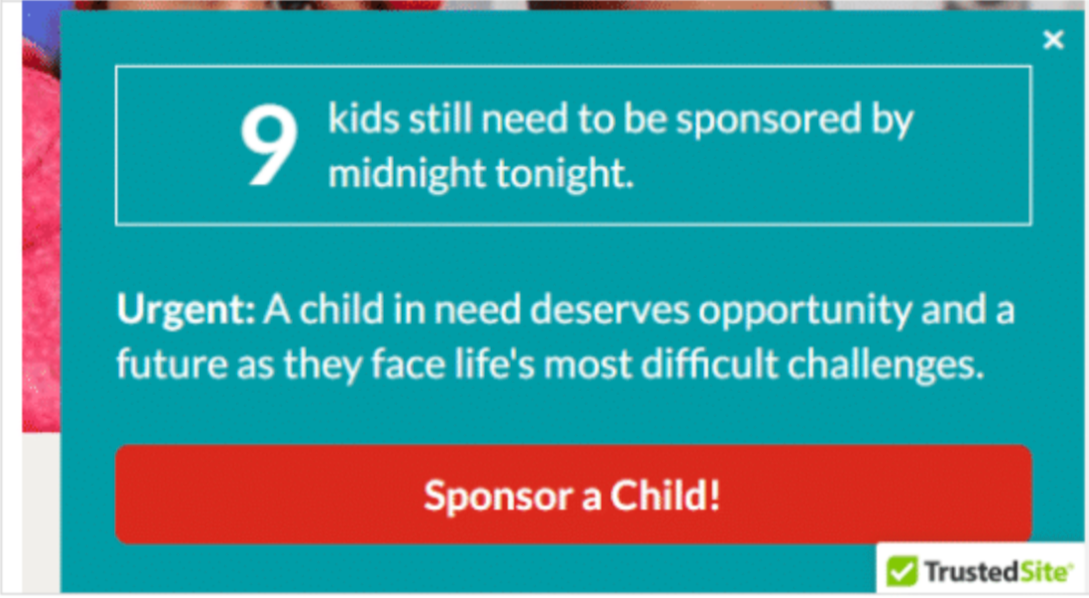 We wanted to test a slide out with a specific number of children left in need of sponsorship by midnight vs. a (rotating) specific child above the search functionality that a potential donor could choose to sponsor.