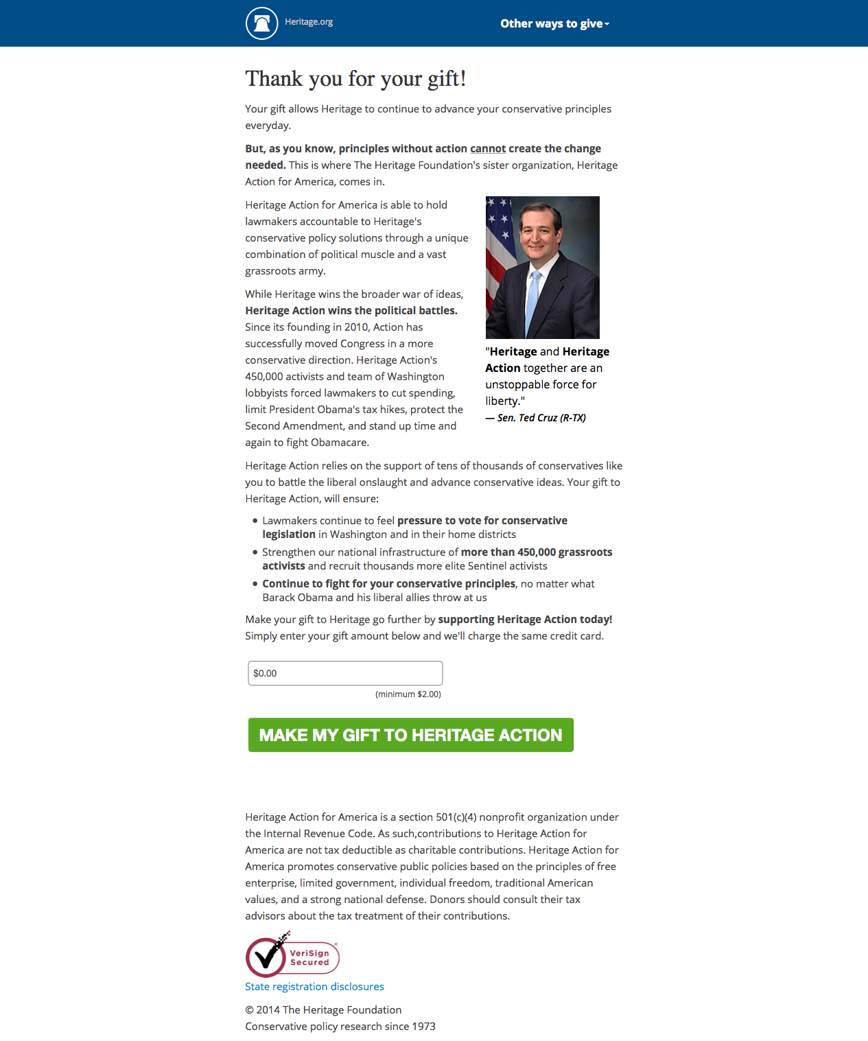 With the number of donors each month, the thank you page on the primary Heritage donation form offered an opportunity for testing. In an effort to further capitalize on the donor’s motivation, we created two follow-on calls-to-action to either become a recurring monthly donor or to give a gift to their sister organization, Heritage Action.