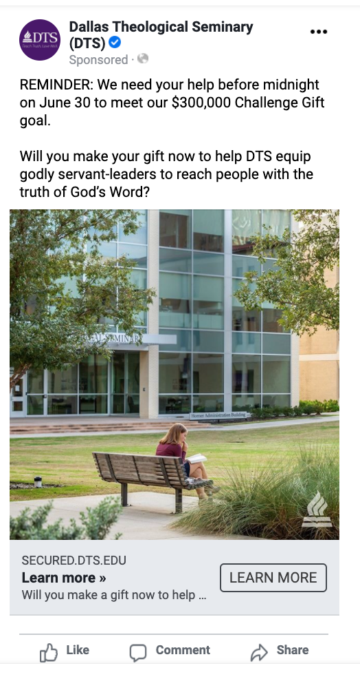 While neither treatment had enough run-time to see valid results since it was a short, time-bound campaign, the ad that had "Learn more about becoming a Cornerstone Partner" as the call to action increased traffic by 65.6% with a 91.8% level of confidence. The second treatment with the banner graphic also drove clicks up 21.8% but only had a 62.7% level of confidence. We will look for additional opportunities to test the banner graphic in acquisition ads to see how the belief alignment impacts traffic and conversion rate for both online courses and instant donation pages.