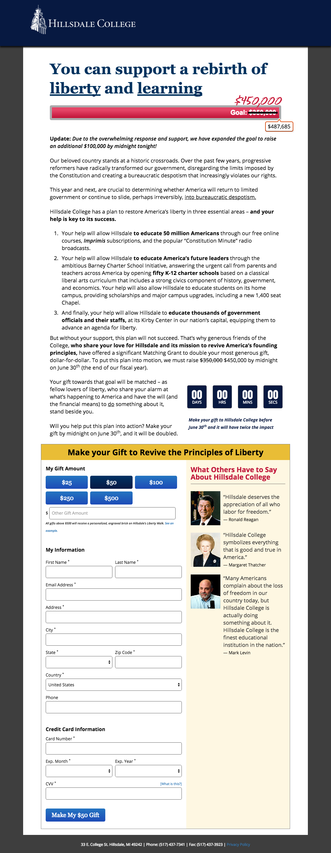 During their fiscal year end campaign, Hillsdale College had set a target revenue total as a way of establishing the need. Historically, we had used a progress meter found at the top of the page as a way of communicating both the goal and the progress toward it. As the end of the campaign approached, we wanted to determine if these progress meters had the impact on revenue that we assumed they did. Knowing this would help us with future campaigns.