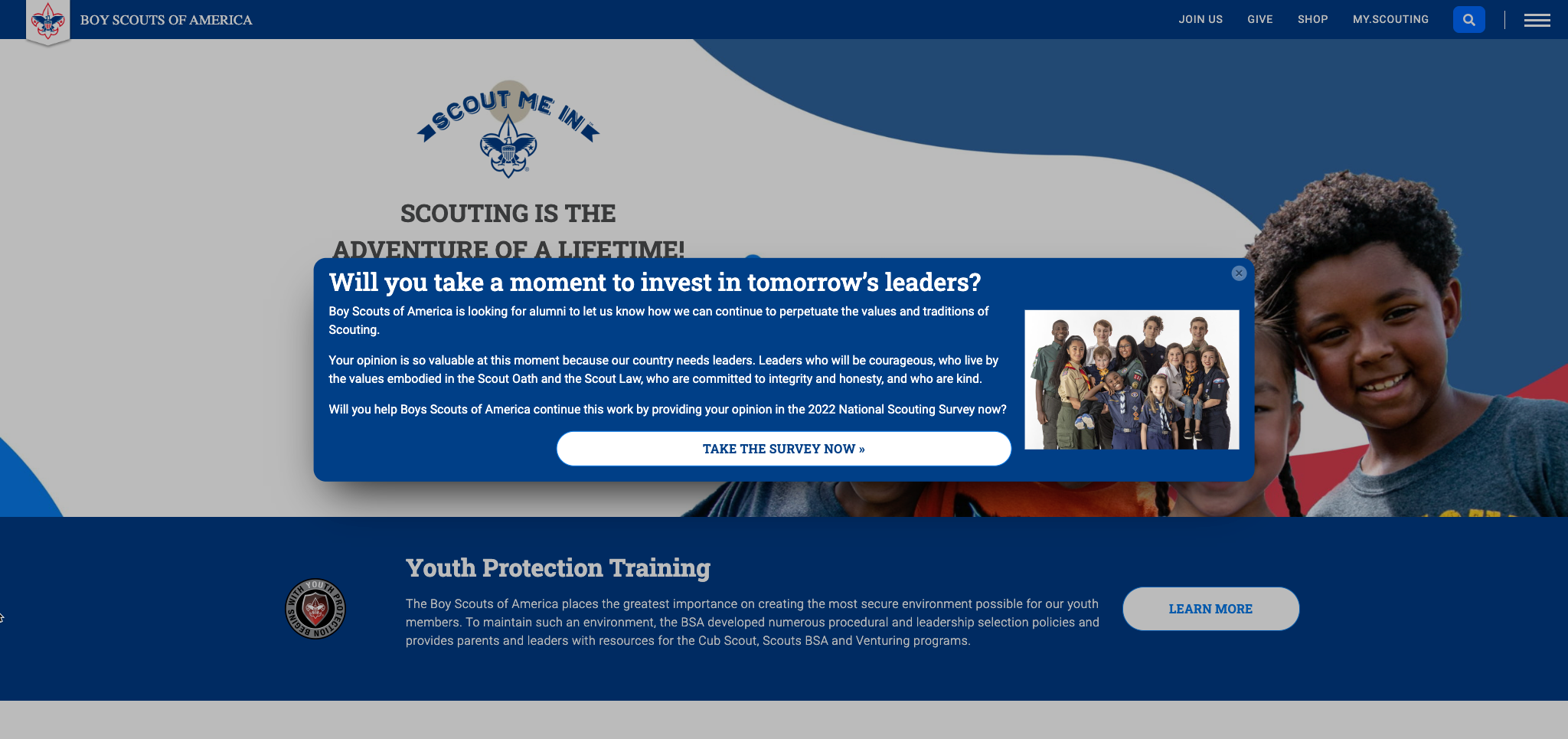 We built a National Scouting survey pop-up modal to live on the BSA homepage to drive survey completions. Internal teams were concerned with site UX and asked that we set pop-up to fire after the user was on the page for 15 seconds. We believed a shorter duration of 5 seconds would produce a better result and so we created a split test for half of the users to see a pop-up at 15 seconds and the other half to receive it after 5 seconds had elapsed.