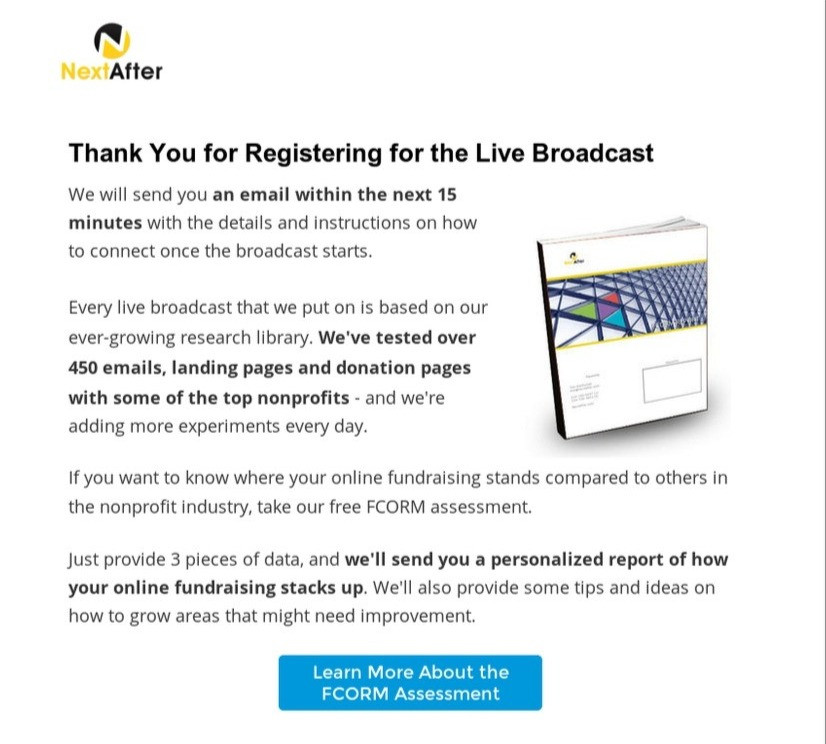 When people completed their registration for a NextAfter live broadcast, we wanted to give them an opportunity to engage with other resources that we offer. Our original control prompted registrants to take our free FCORM assessment, but we hypothesized that this might not be the right next step for most people.