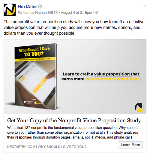 At the launch of our value proposition research study, Why Should I Give to You?, we ran Facebook across our typical Facebook audiences. We wanted to determine what components of the value proposition resonated most with different audience groups early on.