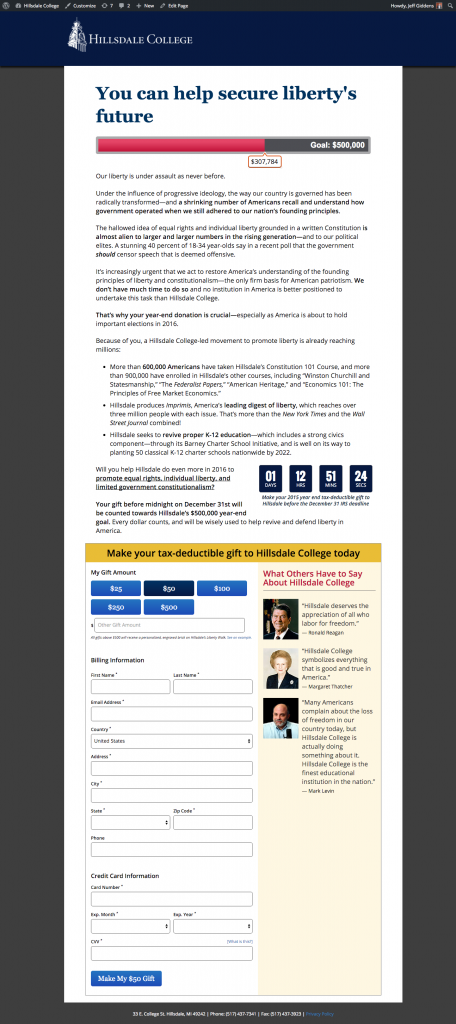 Hillsdale College was nearing the end of their year-end fundraising campaign. Previous tests had shown that more money is raised when the outcome is sold through the headline. Simply put: we get more donors when we reflect what the donor wants rather than what the organization wants.