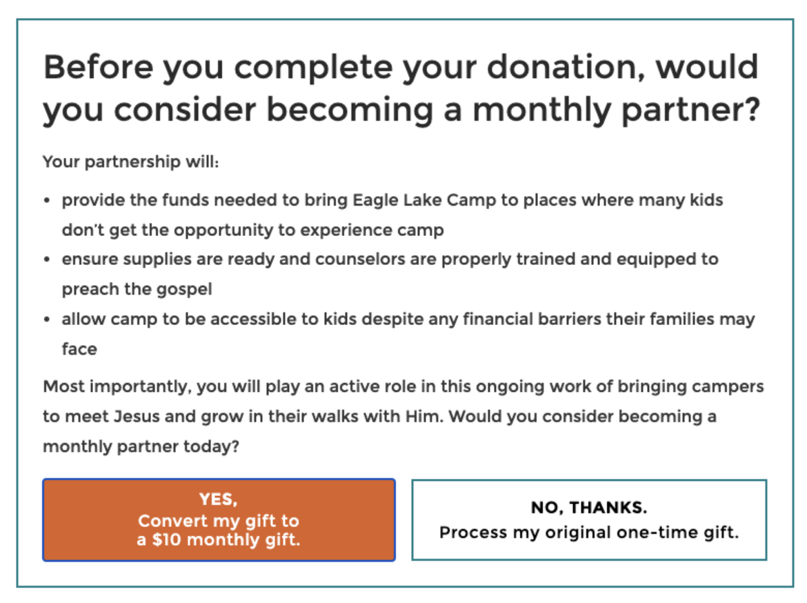 We believe that the addition of the recurring interrupter for Eagle Lake Donation Page donors will achieve an increase in recurring giving because the donor is asked to give less upfront but have a larger impact.