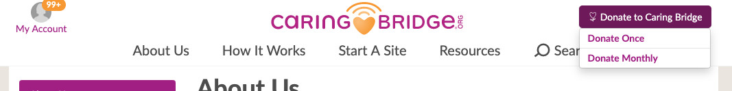 For Caringbridge, the primary navigation has always had a prominent donation button in the top right corner. This button took all potential donors to a generic donation page that offered both one-time and recurring giving options.