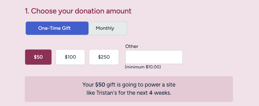 We believe that a dynamic impact array for users on the tribute donation page will achieve an increase in donor conversion rate and revenue because it encourages interaction with the array and clearly outlines the impact of a donor’s gift amount.