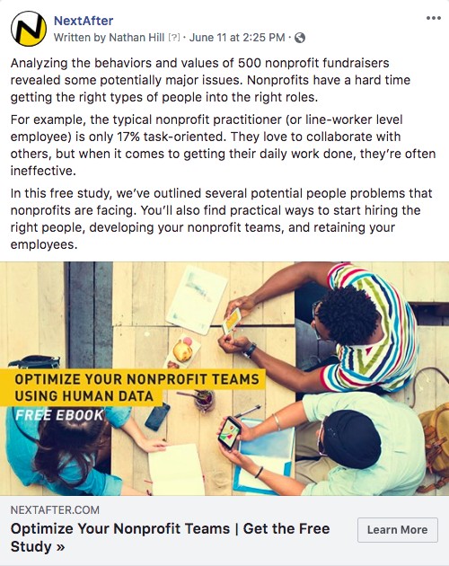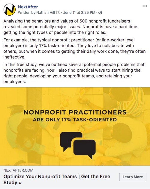 In this experiment, we wondered which ad approach would be most effective for the “Nonprofit News Sources” audience when promoting a recently published study about fundraising teams.