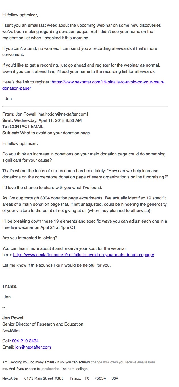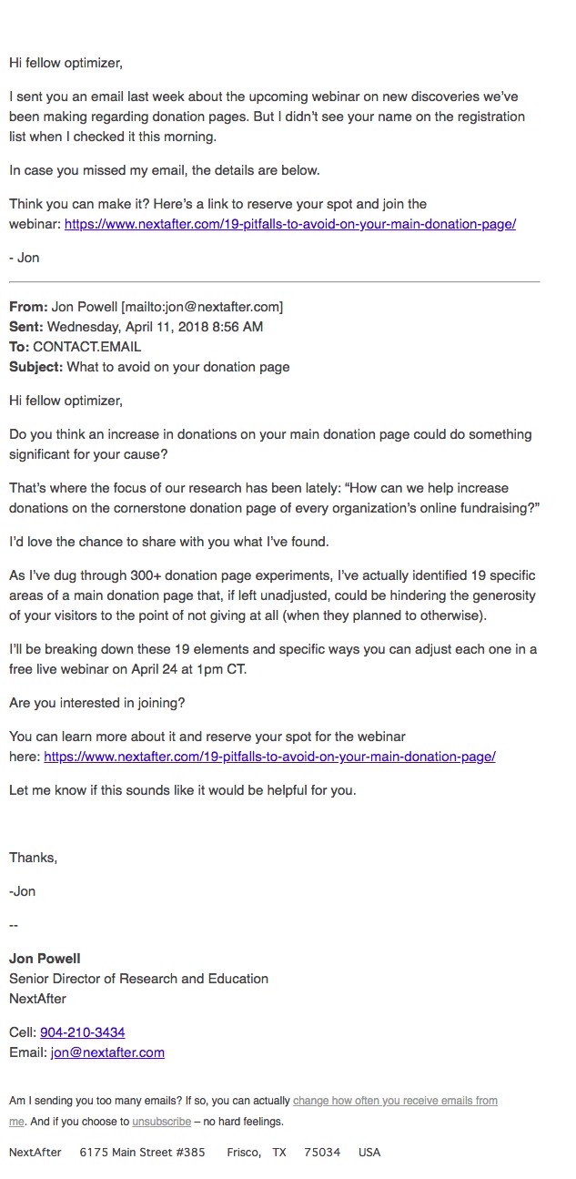 This email was a retargeted send to those who had yet to register for the upcoming webinar. We had previously tested into an email that simulated an email forward (but in a non-spammy way). It was personal, checked in to see if they had received the previous email, and included the previous email below.
