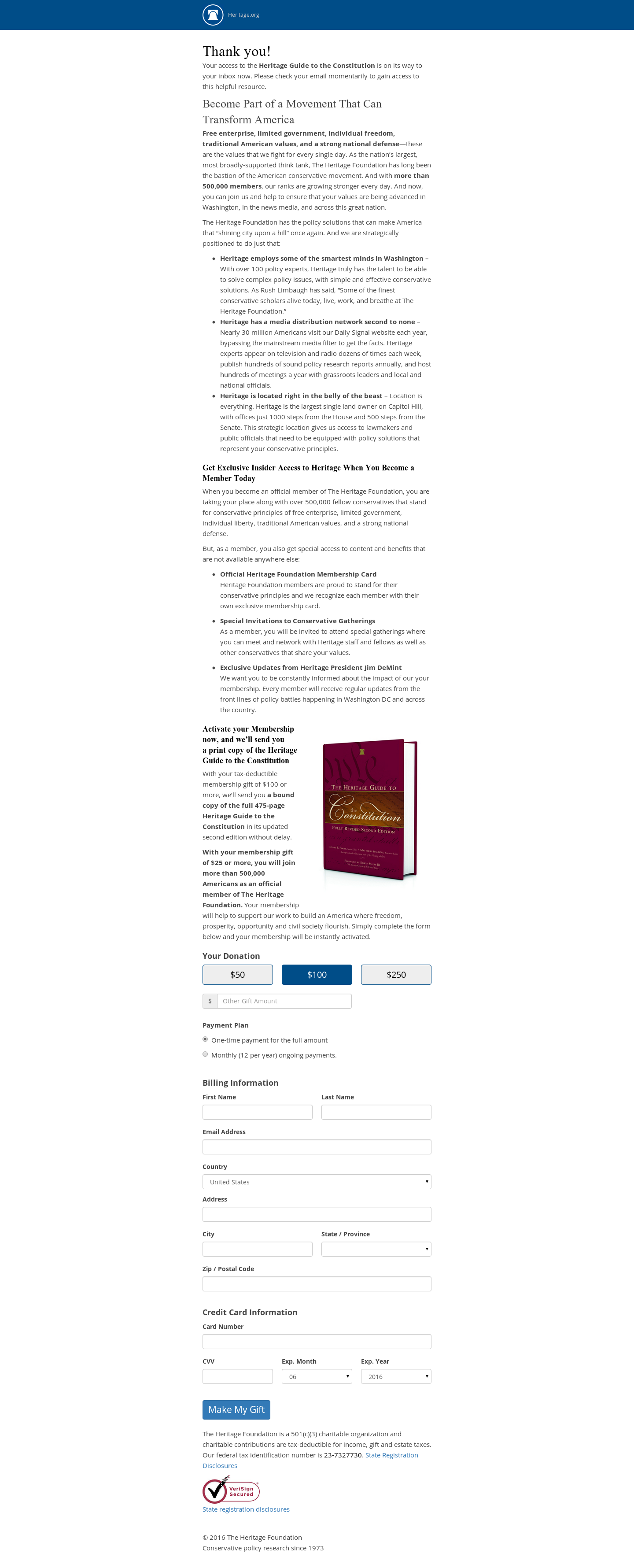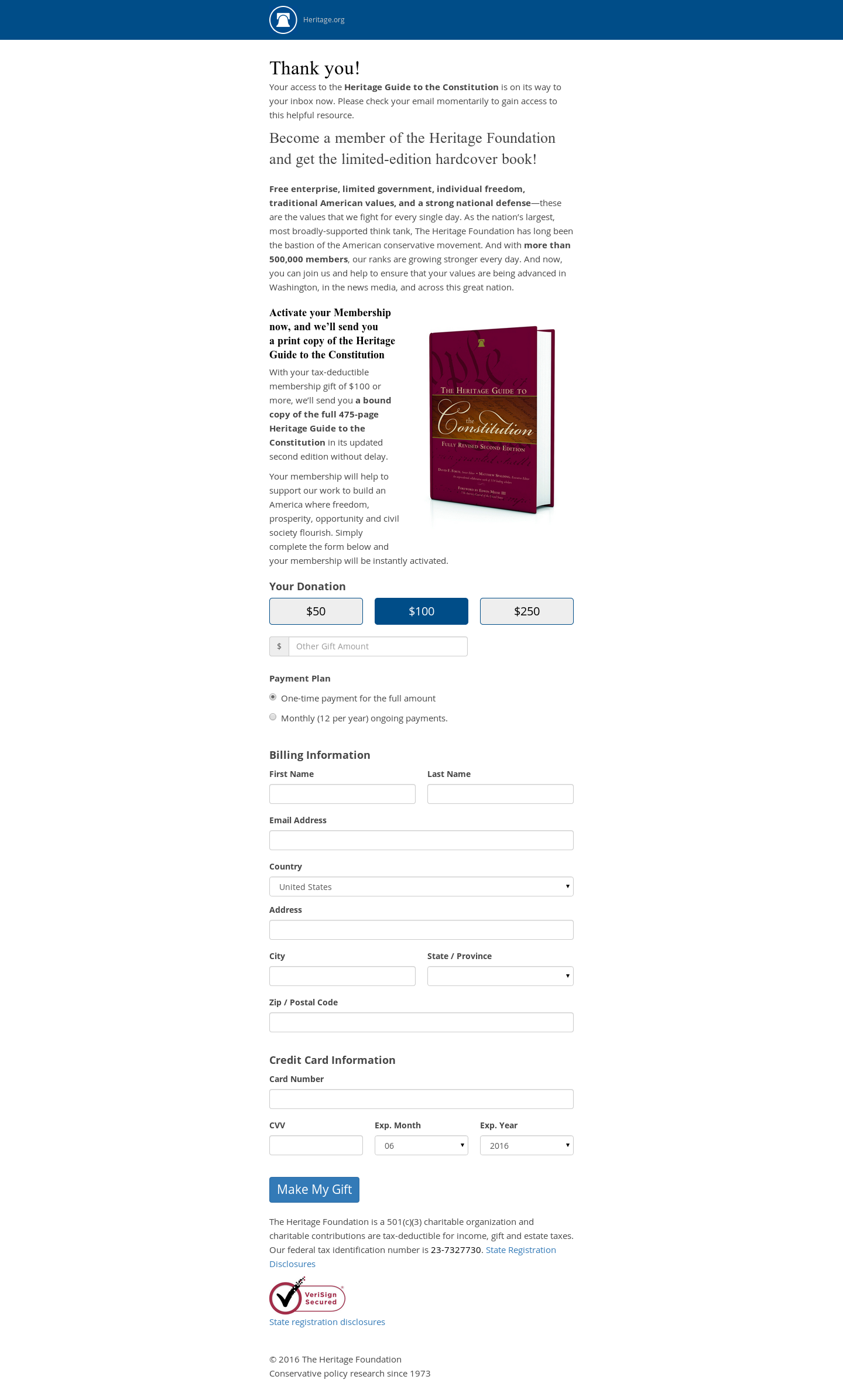 On the instant donor conversion page for the email acquisition offer “Guide to the Constitution,” we wanted to test whether the membership language was creating significant enough friction to the process to be negatively impacting conversion. We decided to test removing this language to see what kind of impact it would have on the results.