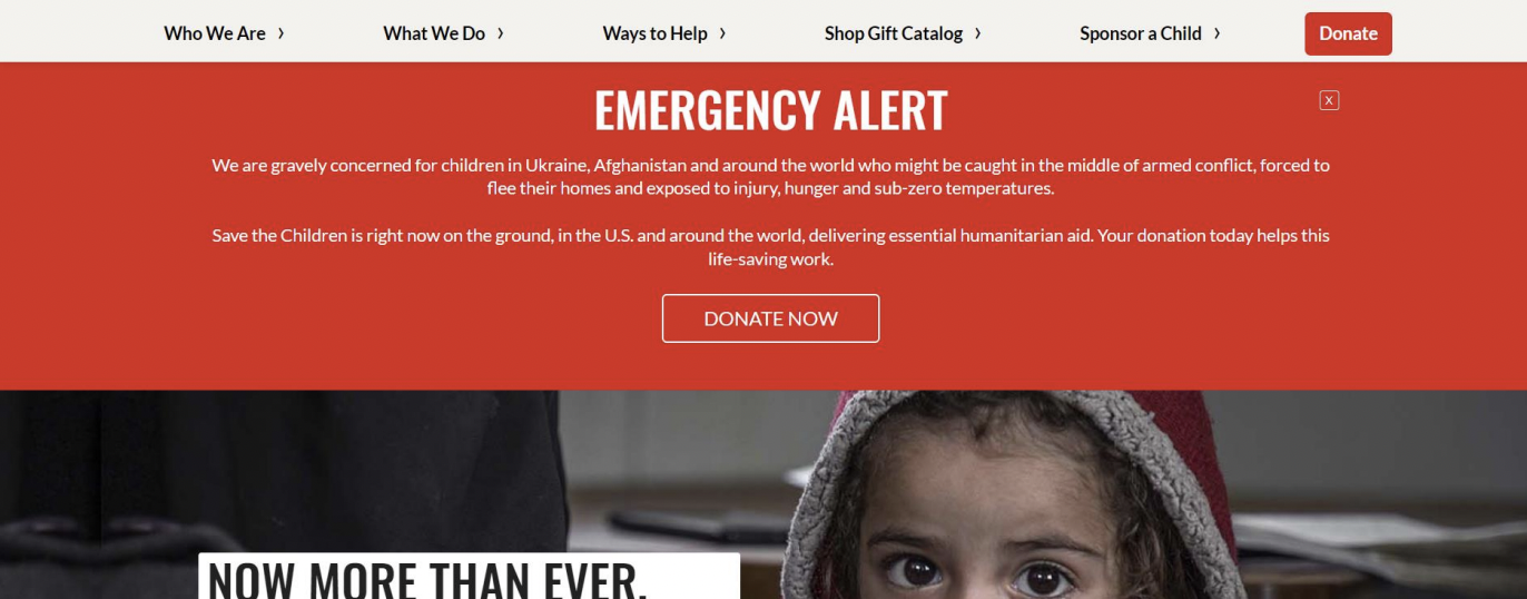 When emergency relief is needed somewhere around the world, Save the Children traditionally places an emergency alert banner on their site. The banner can’t be missed on the site because it takes up quite a bit of real estate, is bright red, and says “Emergency Alert”. Save has tested the copy that is on this banner in the past, but there hadn’t been significant testing around the tactical approach of driving urgency and conversion.