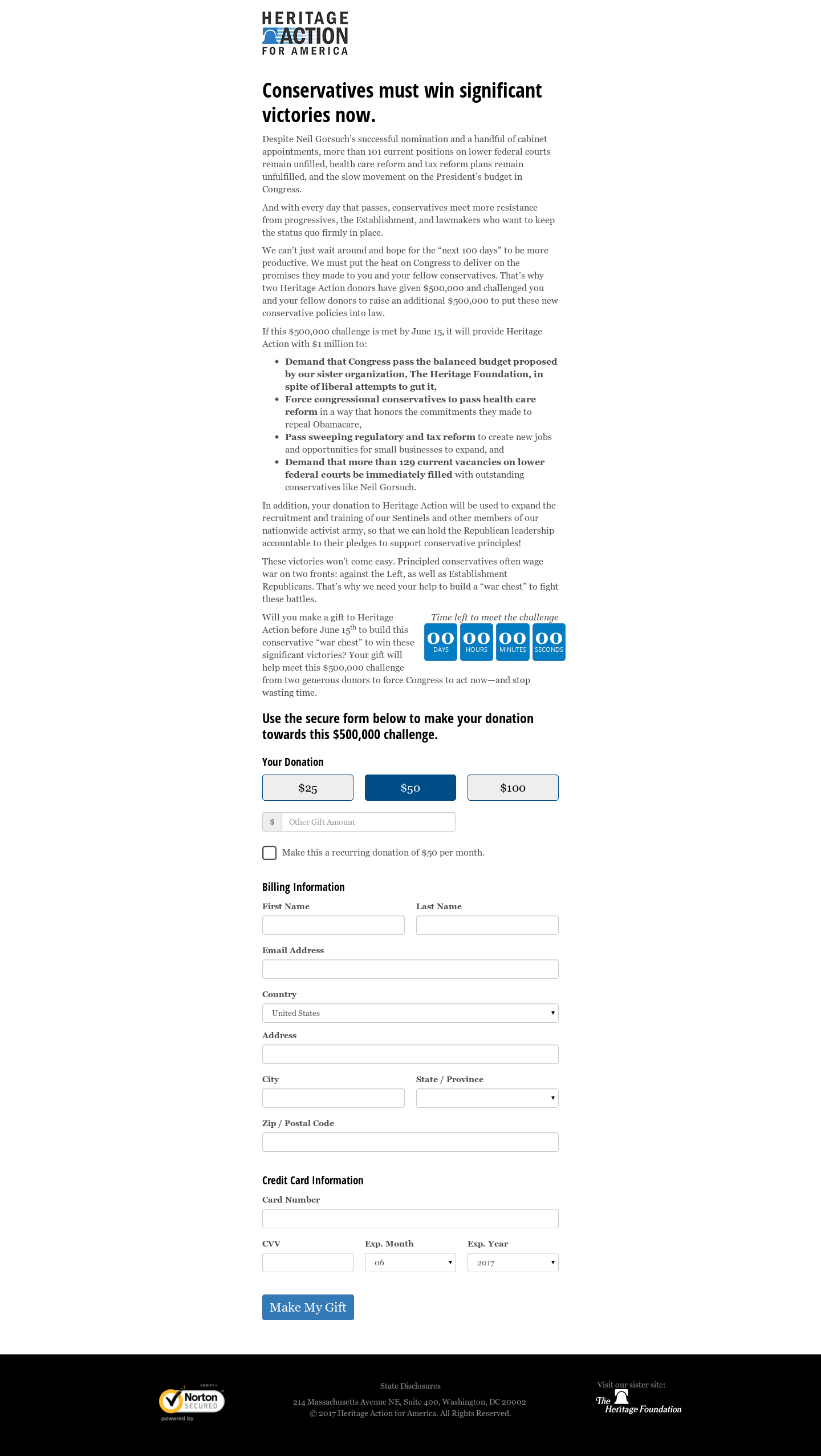 Heritage Action was raising funds to spur Congress to action on several initiatives. They had recently reviewed donor research that revealed that their sister organization, The Heritage Foundation, was a big factor in their donors’ decision to give. Though this campaign was raising money for Heritage Action, they hypothesized that including some copy to integrate the value proposition of The Heritage Foundation into the copy might increase donors’ likelihood to give.