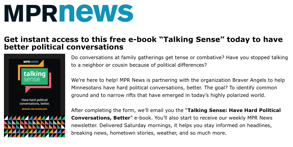 In an effort to increase sign-up rates on MPR’s Talking Sense e-book landing page, we conducted a headline test designed to more effectively communicate the value of the offer to visitors. Our goal was to determine whether a more explicit, benefit-driven headline would lead to higher engagement and conversions.