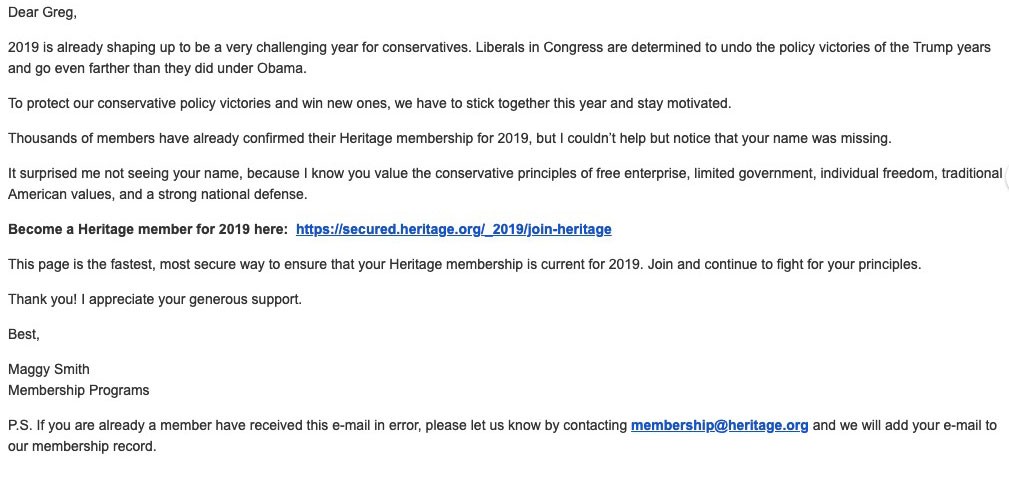 During The Heritage Foundation’s Kickoff Campaign in 2019, we wanted to experiment with a more motivating postscript at the end of an email that was sent to non-members. Most of the postscript messages within the campaign were transactional in nature (if you received this in error, we apologize). Would sending a core message in the postscript to motivate non-members to give work?