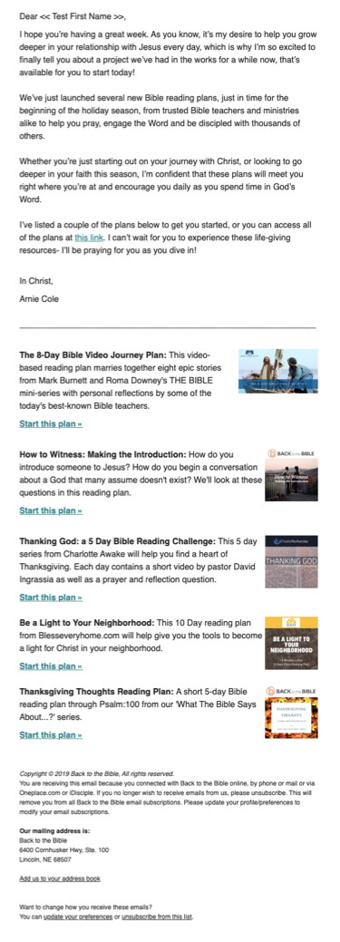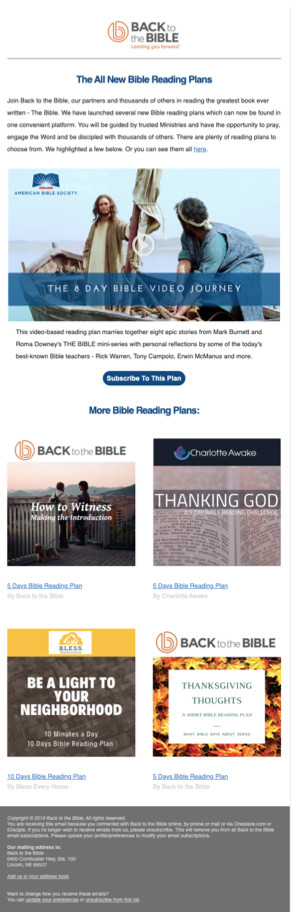 Back to the Bible offered people on their emailing file the opportunity to sign-up for a free Bible Reading Plan. The control email that was being sent used a marketing template and lots of images. We hypothesized that a stripped down email could help improve email engagement.