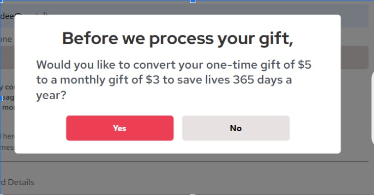 So, an additional 1-2 sentences in the popup explaining the benefit to the donor for making that switch. Also, in the experience, selecting the option to switch to a monthly gift would update the donor form with the new gift amount and select the checkbox for recurring, but the donor would still need to resubmit the donation. Having a checkbox may have added additional friction to the process.