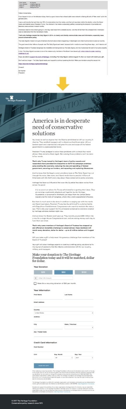 During The Heritage Foundation Board Match fundraising campaign, we wanted to incorporate one of their more popular programs (The Daily Signal) into a fundraising appeal email. The goal was to show the broad impact of the organization by talking about the various aspects of the organization.