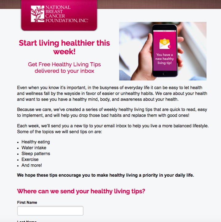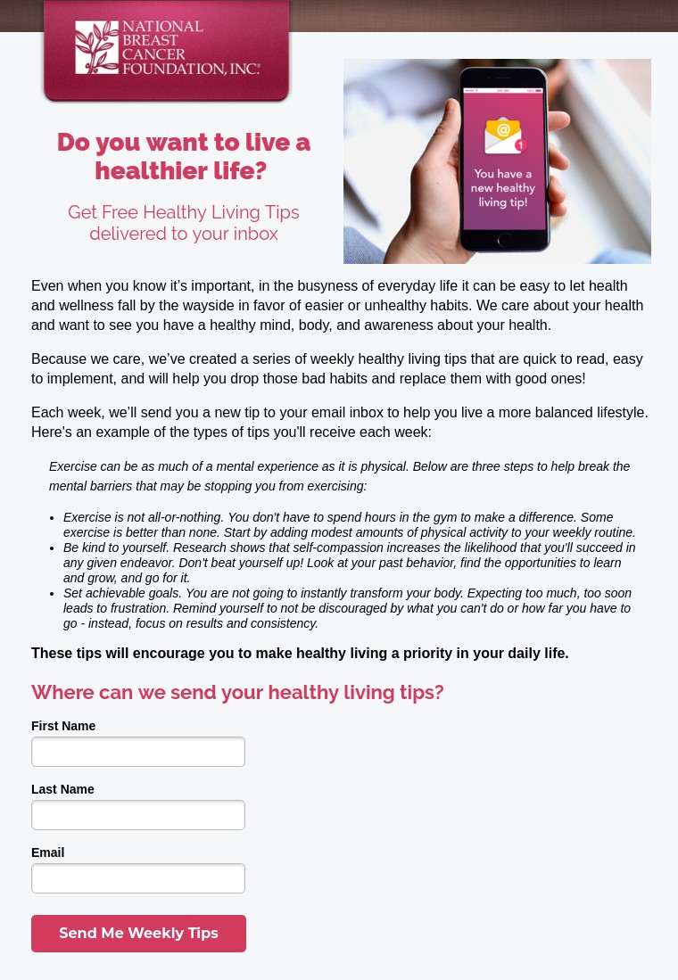 NBCF was offering free healthy living tips as an acquisition offer, and wanted to test whether adding a question in the headline would increase people’s motivation to download the offer.