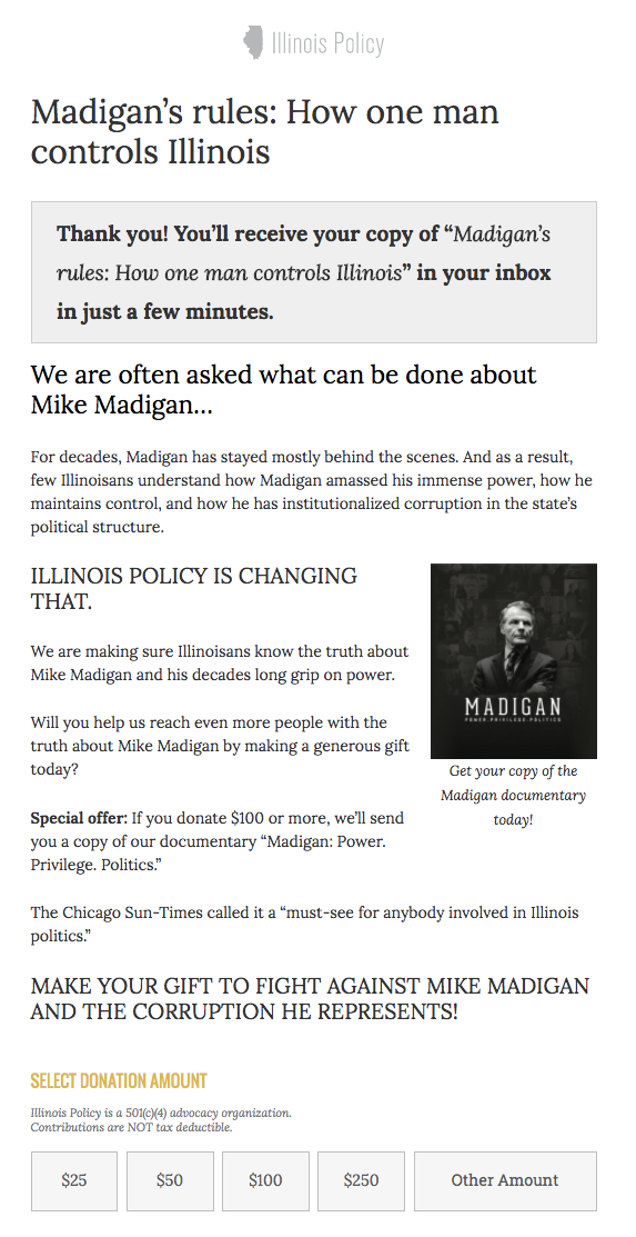 Illinois policy Institute was promoting their free e-book about Mike Madigan to several Facebook audiences, and then asking for a donation on the following page. They had a premium-focused page that was not producing donors, and wanted to test a more mission-focused page. They create a treatment that removed the premium (in case that was “getting in the way of the donation”) and focused on the value and the efforts that they are undertaking to remove Mike Madigan from office.