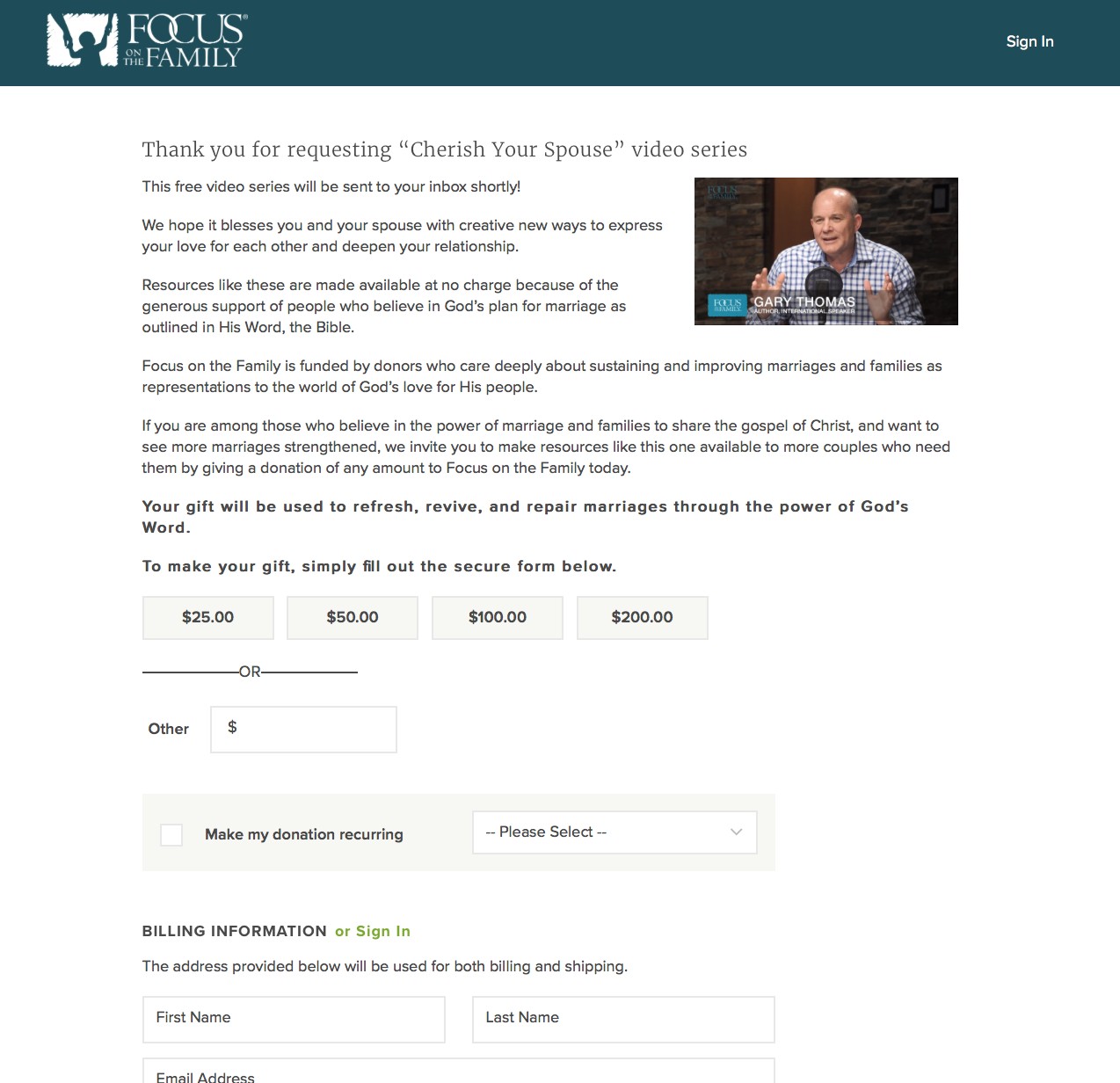Focus on the Family offers a free video series for couples on a variety of topics. One of the topics is about how to better cherish your spouse. They sent people to sign-up for this video series through many different channels. After a person signs up for the series, they are immediately given an instant donation ask on the confirmation page. In reviewing the original instant donation page, we hypothesized that a radical redesign – one that focused on the value proposition and how it was presented – might increase donor conversion. To test this, we rewrote the copy on the page, put them in numbered steps, and asked for a specific gift amount attributing the amount back to what it would help do. We then tested this version against the control over four weeks to see the results.