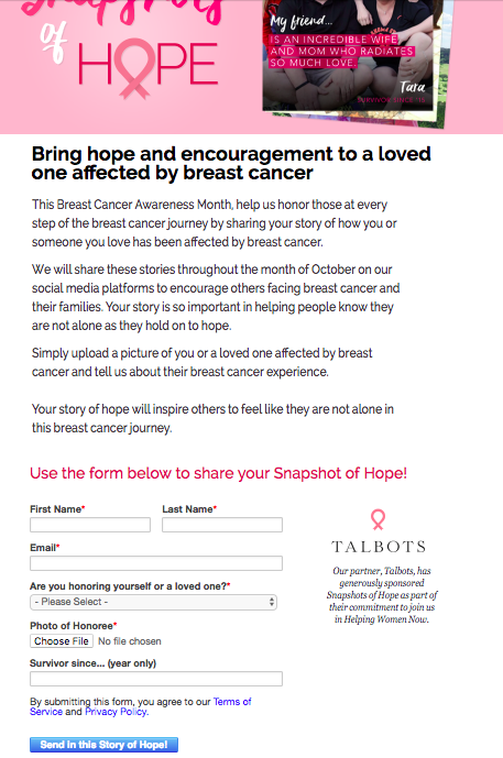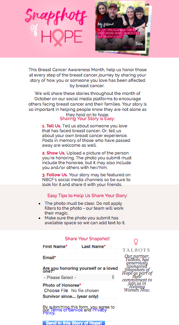 National Breast Cancer Foundation was running their BCAM campaign and wanted to test a redesign of their Snapshots of Hope acquisition page, which asked for stories from survivors or family members of people with breast cancer.