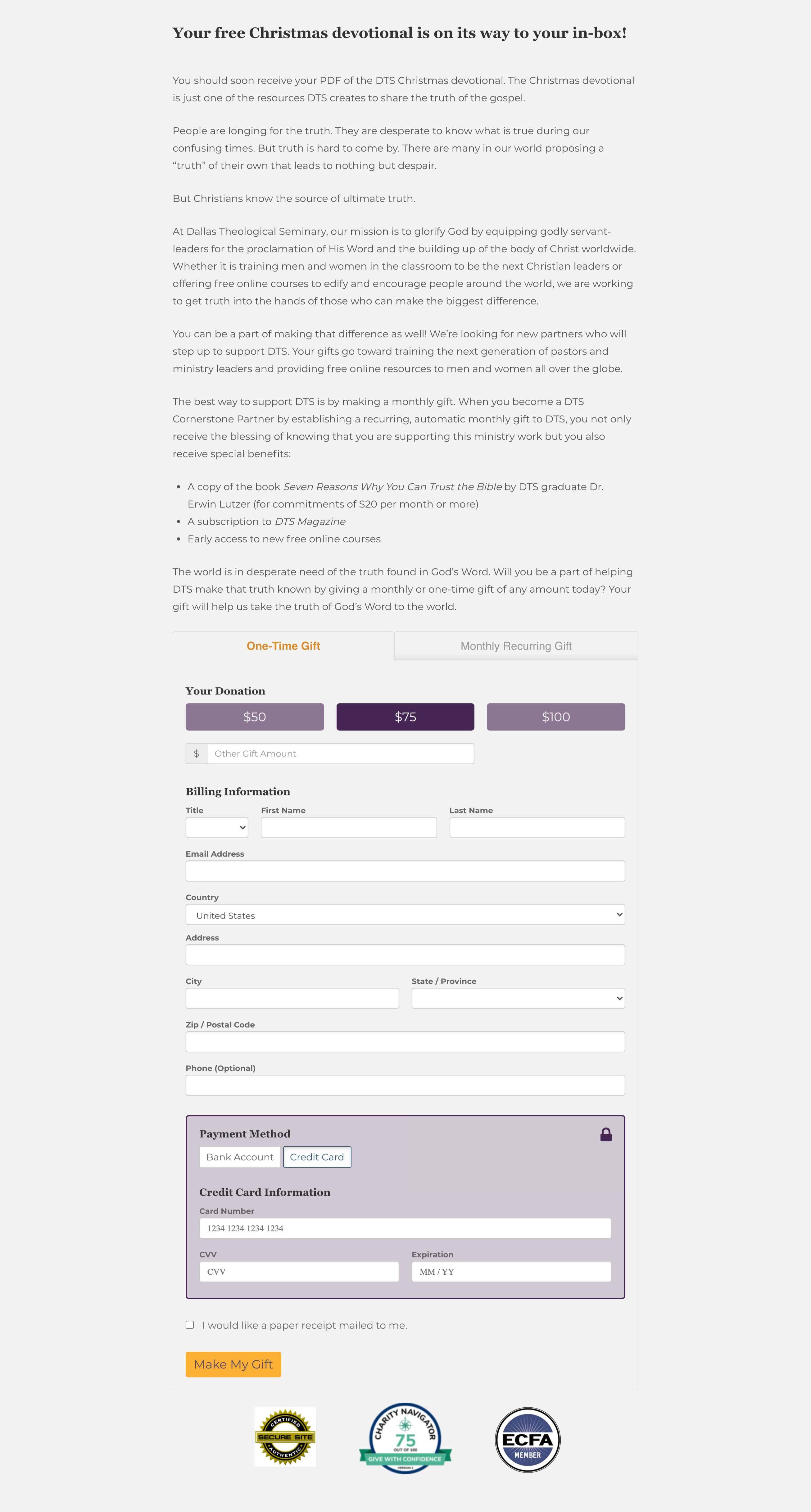 Ahead of their calendar year-end campaign, DTS sent out a digital Christmas Devotional as a cultivation piece to their housefile. The control donation page used their standard appeal language with a paragraph outlining the benefits of monthly giving. To increase recurring gifts, we wanted to test a donation page treatment that specifically asked for a monthly recurring gift emphasizing a microask goal of 10 new daily monthly donors. In addition to the microask goal, we made several other optimizations to the page. We swapped out the headline to reflect that their monthly gift would have an impact 365 days a year and introduced the concept of donor autonomy and value alignment throughout the copy by asking conversational questions such as “Would you consider becoming a Cornerstone Partner?” and “Will you make a monthly gift today to help share biblical truth with the world?” We split traffic 50/50 between the control and the treatment for visitors after they signed up to receive their copy of the digital Christmas Devotional.