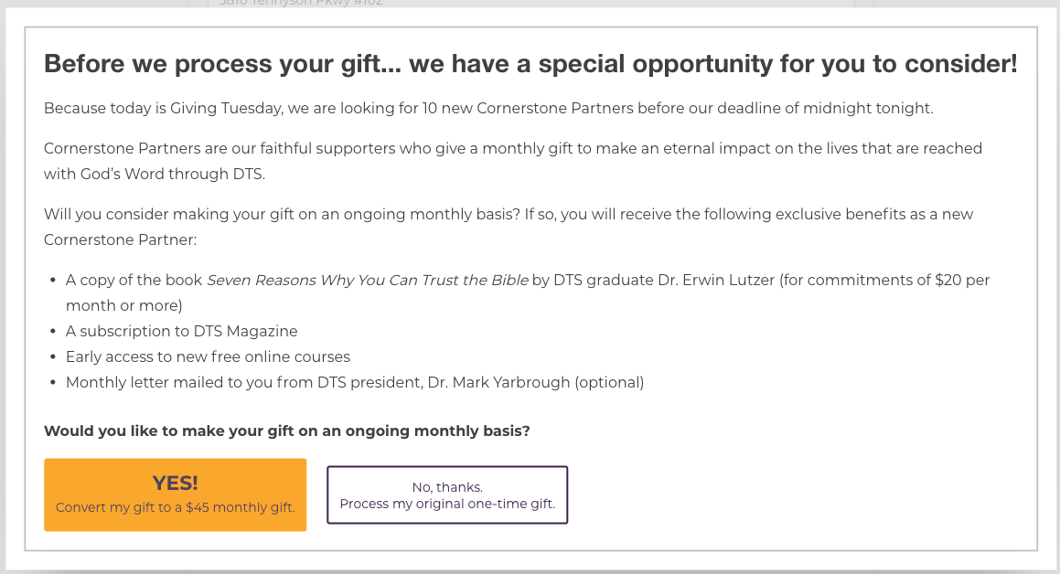 For previous giving day campaigns, we had seen an increase in overall donor lifetime value and retention for monthly donors. We wanted to find a way to convert one time donors to monthly donors on Giving Tuesday and decided to test a recurring giving pop-up at the point of transaction for one time gifts. The popup intercepted the user before their gift was processed and urged them to convert their one-time gift to monthly instead and reiterated the benefits of giving a monthly gift. We displayed the pop-up to 50% of traffic during the giving day campaign to evaluate its effectiveness.
