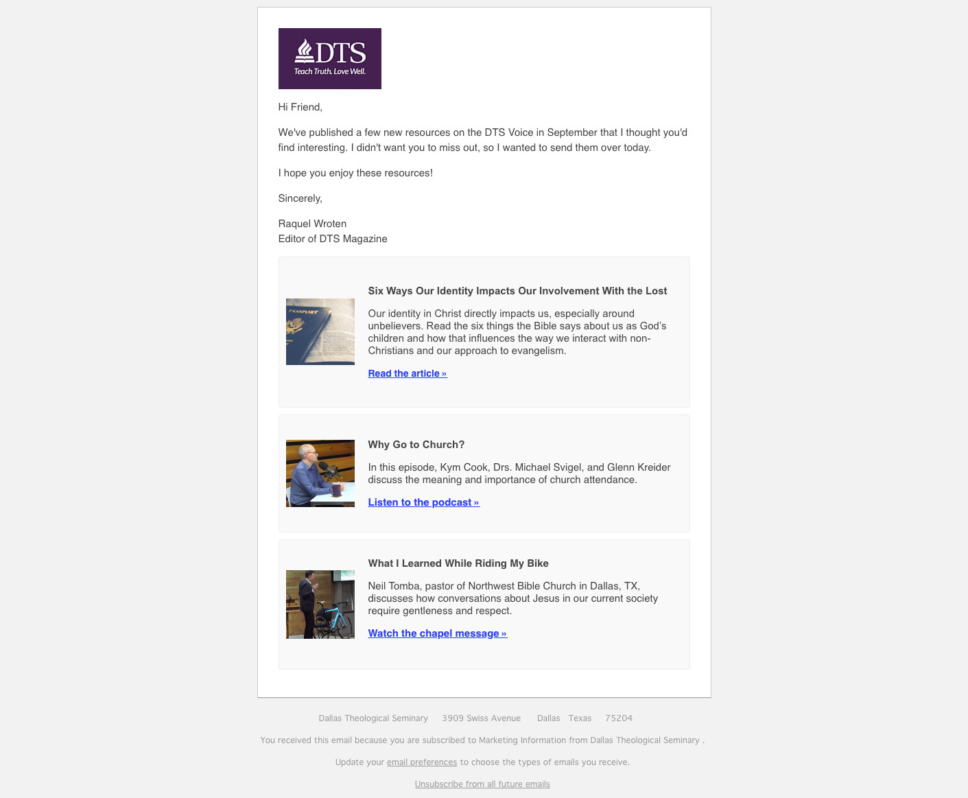 In a previous test, DTS was sending out their top three DTS Voice articles to their subscribers as a cultivation opportunity, and wanted to see whether a simplified template (links only in bullet points) or a more designed layout, with imagery and CTA’s along with blurbs about the content, performed better. They used the same content pieces in each email.