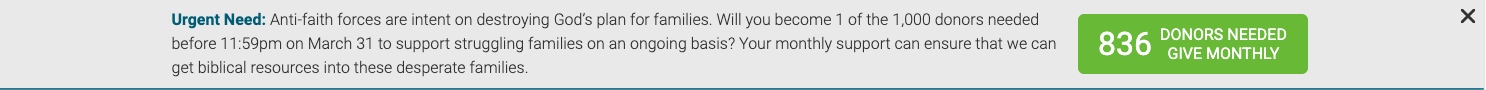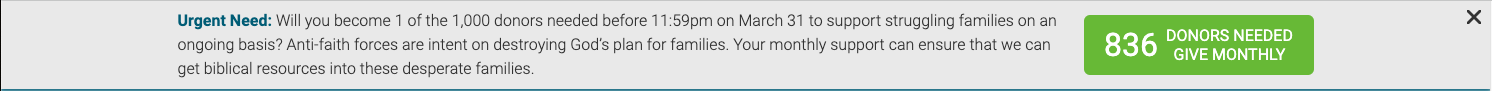 Because of this observation, we do believe that the urgency created by presenting a countdown of 'donors still needed' does play a role in inspiring people to give by at the very least prompting them to make a lesser commitment in the form of a one-time gift.