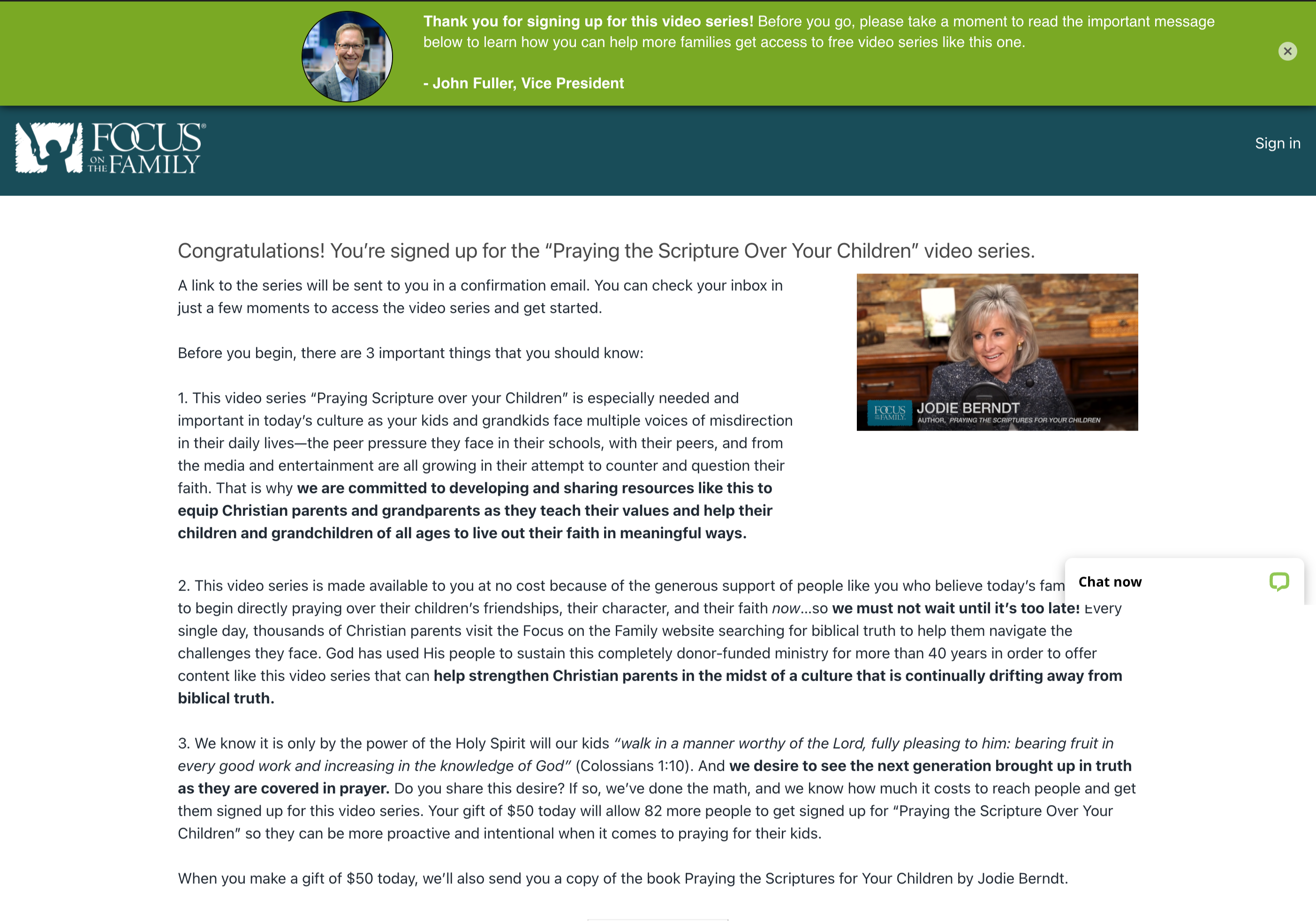 In an effort to improve donor conversion, we wanted to further “humanize” the instant donation page for Focus on the Family’s video series subscribers. We developed a treatment that included a special message sticky bar from a Vice President encouraging visitors to remain on the page and take the time read the donation page offer. The sticky bar included a photo of the VP and the following note: “Thank you for signing up for this video series! Before you go, please take a moment to read the important message below to learn how you can help more families get access to free video series like this one.” We split traffic 50/50 and launched this treatment on several active donation pages to observe the impact of the sticky bar on donation conversion.