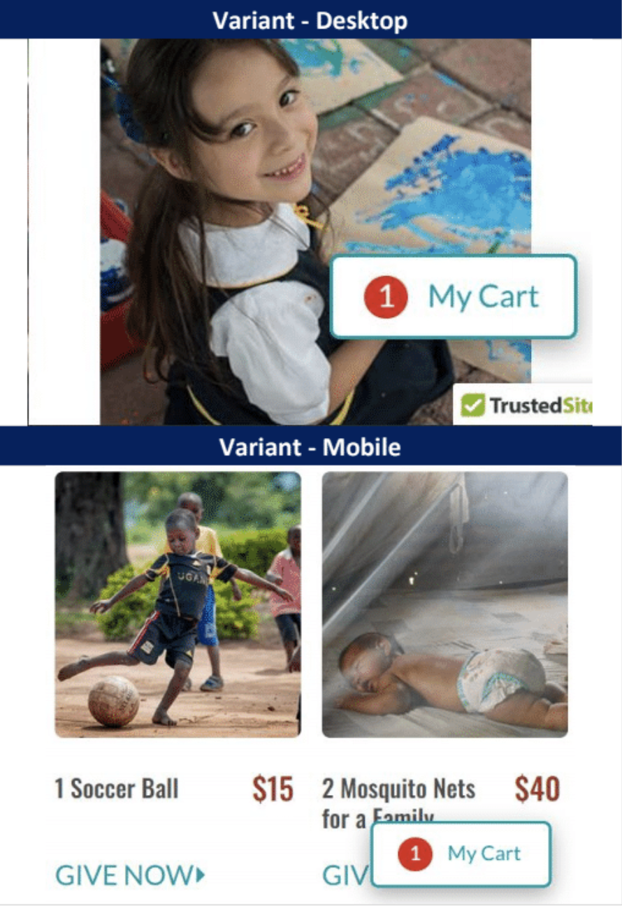 We believe that adding a sticky cart button for donors who add an item to their cart (scroll persistent), will achieve a greater number of donor conversions.