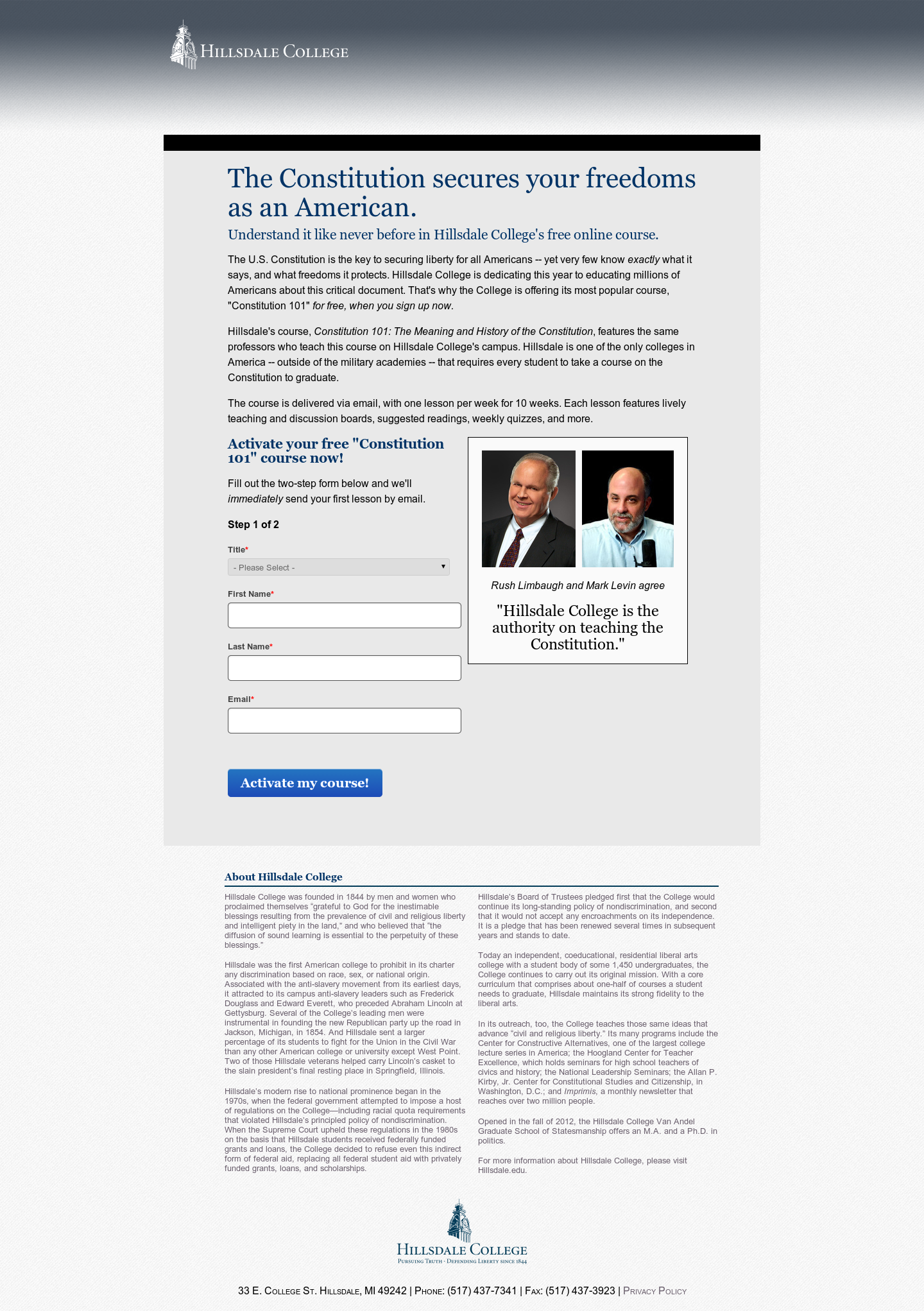 Hillsdale College was promoting their free Constitution 101 course through multiple online channels. The control signup page converted nearly 40% of visitors to enroll in the course, but it also assumed that the primary value proposition, “Understand the Constitution like never before” resonated with each visitor.