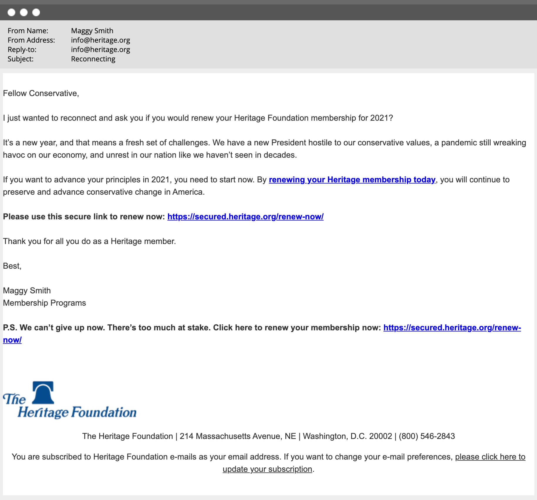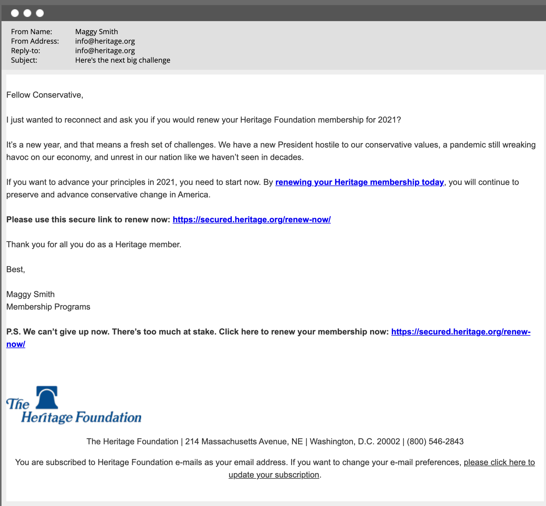 For an annual membership campaign, we wanted to look at ways to optimize the email envelope for The Heritage Foundation appeals. We had a set of historically used subject lines and wanted to test using a different subject line to drive email engagement. We set up the control as “Here’s the next big challenge” and developed a treatment subject line using only the word “Reconnecting”. The sender and body copy remained the same for each version.