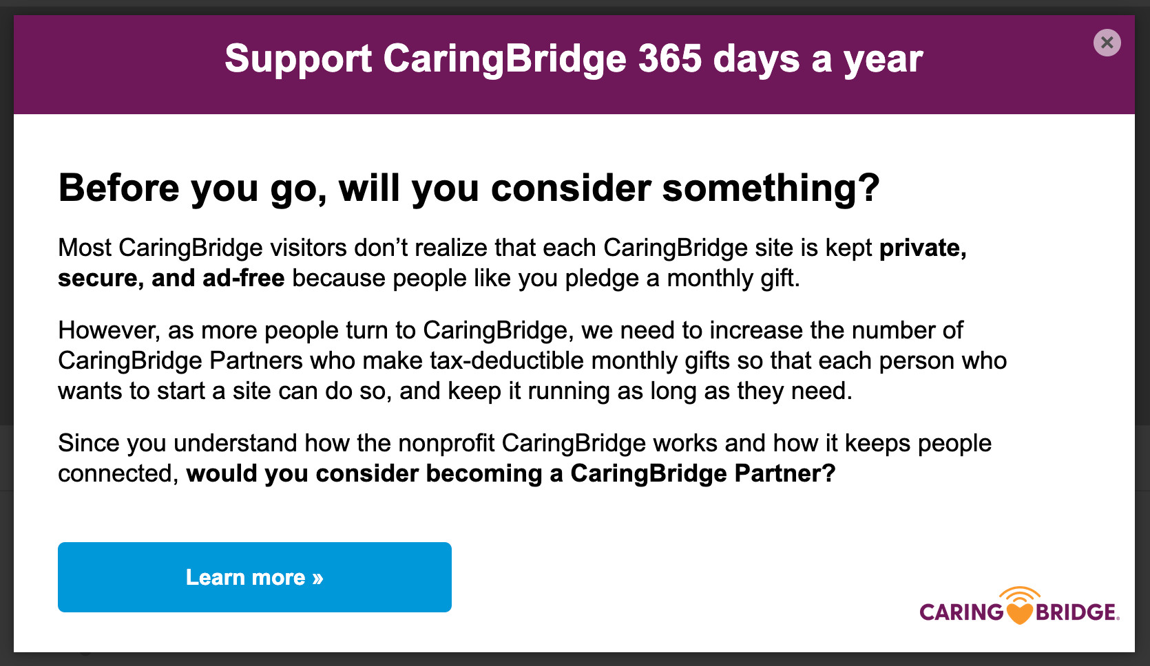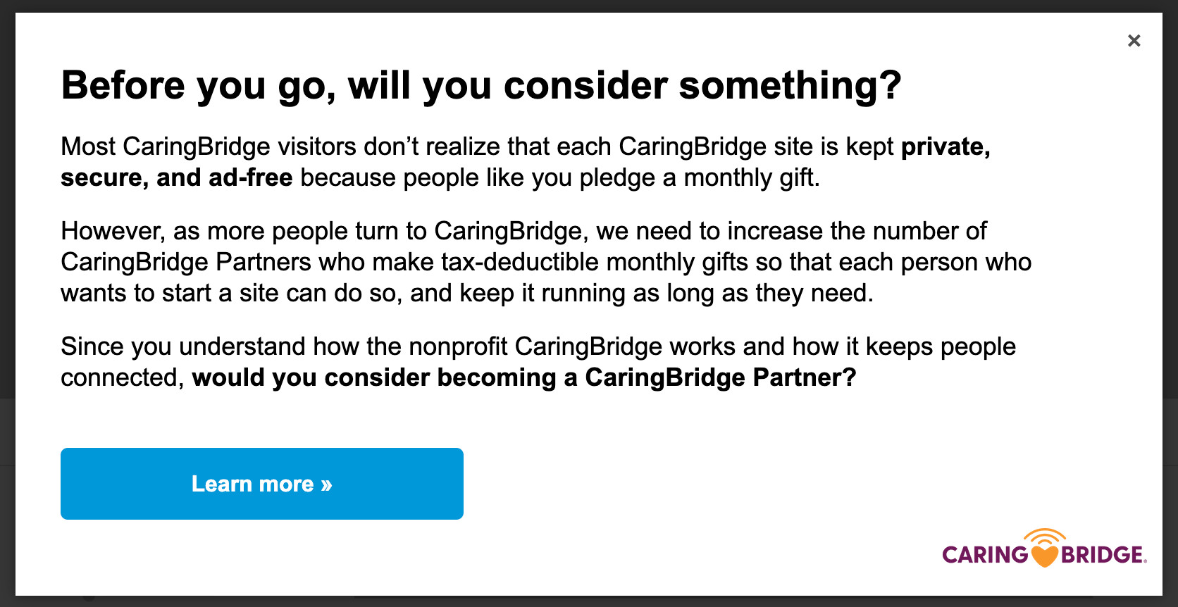 CaringBridge had been running a popup that showed up on the 8th visit and offered the reader the chance to become a CaringBridge partner, or recurring donor. They had seen other tests where adding in a single-line motivational top banner to the popup might increase motivation to click. They decided to test this across both an exit intent desktop banner and a forced-popup mobile banner to see if they could increase clickthrough rate.