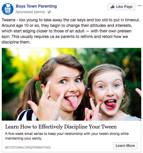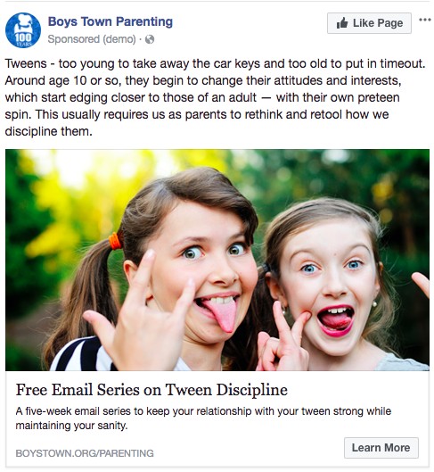Boys Town runs Facebook ads promoting a free parenting series for Tweens. We hypothesized that a headline more focused on the value of the offer might help increase conversion. The control headline was specific to what the content offer was “Free Email Series on Tween Discipline”. The treatment we developed communicated the benefit of the offer, “Learn How to Effectively Discipline Your Tween”. We tested the two against each other to see which would increase conversion.