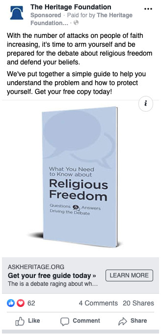 As a part of The Heritage Foundation’s acquisition efforts promoting their “What You Need to Know about Religious Freedom” ebook, we wondered what impact a video-based ad would have on our ability to acquire emails and donors.