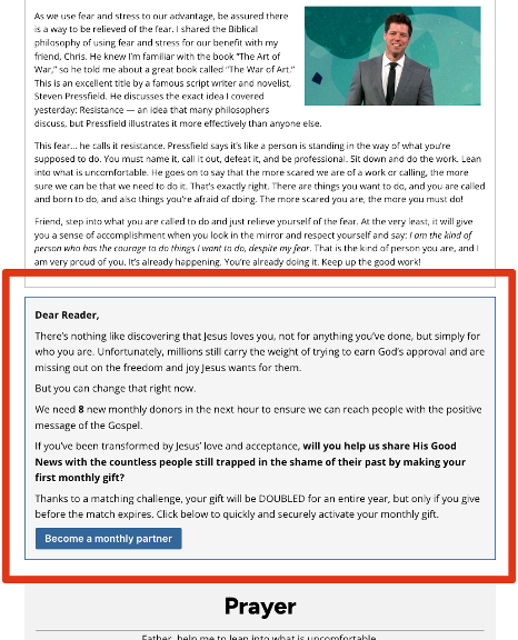 Hour of Power is a Christian broadcast ministry that shares inspiring sermons, ebooks, and daily devotionals through their media presence and website. They have seen success in increasing email acquisition on their website’s daily devotional pages by adding Dear Readers below the devotion, and for their spring high-urgency campaign we decided to see how their traditional Dear Reader asking readers to become sustaining monthly donors would perform against a Wiki-Style Dear Reader.